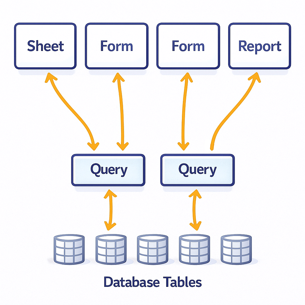 Filter to relevant rows — A query can include conditions (e.g., only active customers, orders from this year), so forms, sheets and reports load only the subset you care about instead of the whole table. With a smaller dataset in memory, operations like sorting, grouping, and search become instant.